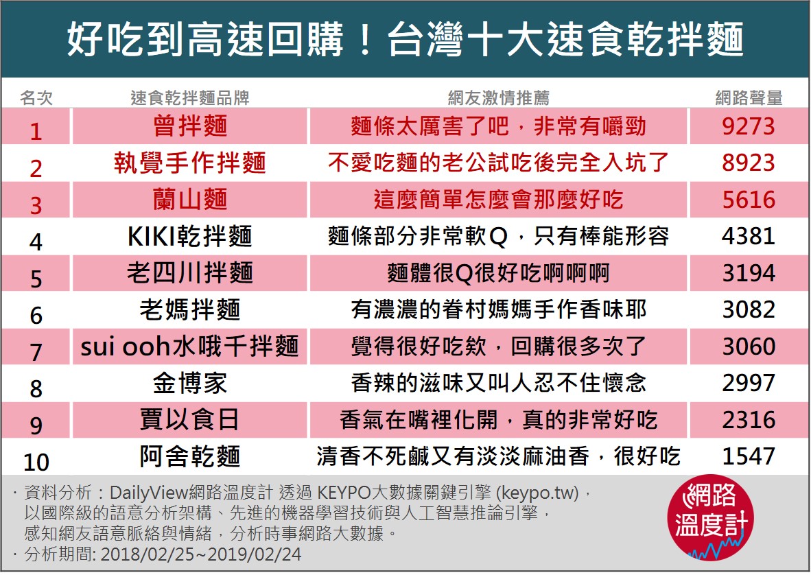 系統觀測上萬個網站頻道,包括新聞頻道、Facebook、PTT及各大討論區、部落格等,針對討論『速食乾拌麵』相關文本進行分析,並根據網友就該議題之討論,作為本分析依據。