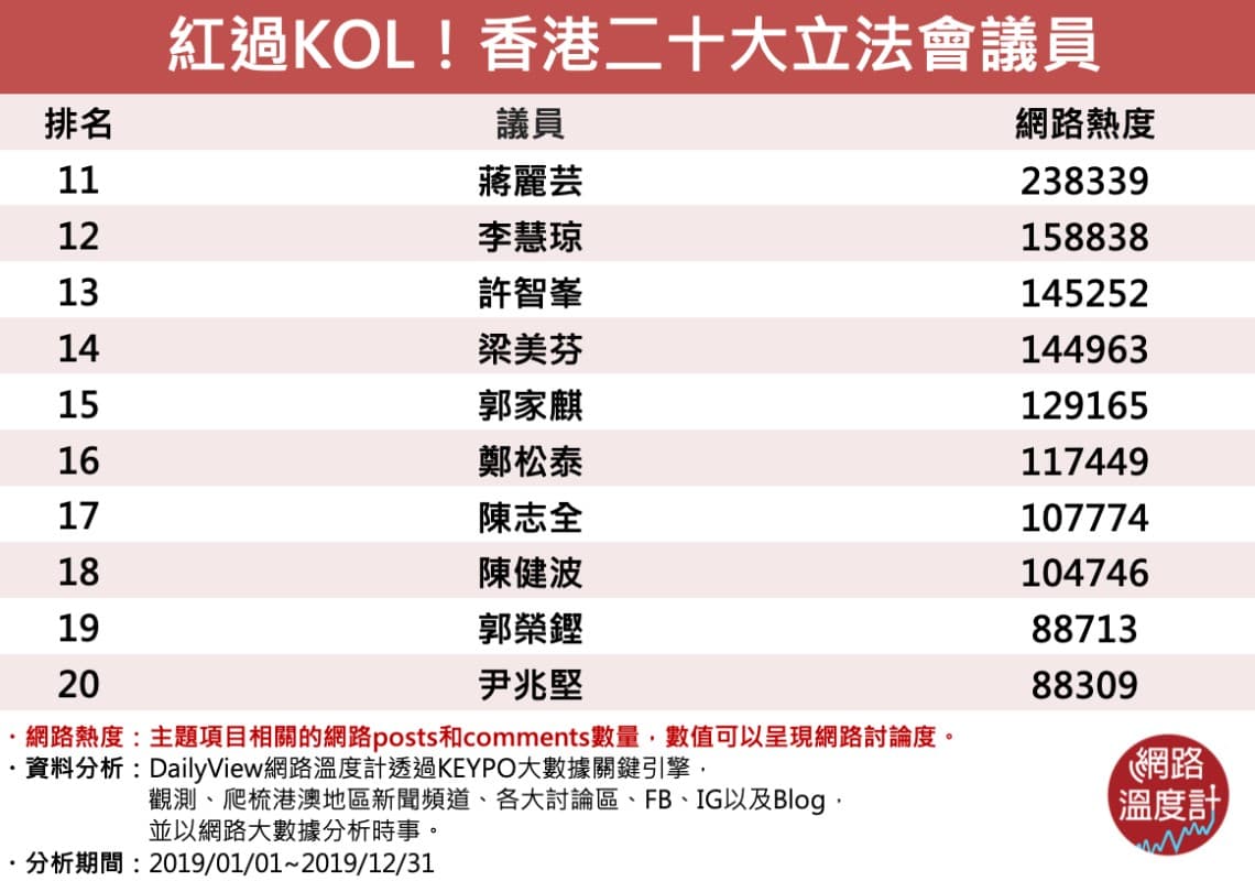 今年喺香港地,就算幾唔識、唔想理政治嘅香港人,都避唔開依場影響全港嘅社會運動。喺依場運動入面,有一班人忽然知名度急升,人氣真係分分鐘勁過明星同香港著名KOL啊!佢哋係邊個?咪就係幫市民代議嘅立法會議員囉。不過呢,人氣高未必等於名聲好,今次就等DailyView用大數據帶大家睇吓,2019年度最廣受人討論嘅20大立法會議員有邊個,再揀10個嚟睇埋佢哋Facebook最多人留言回覆嘅兩個POST,輕輕分析吓香港網民討論佢啲乜啦!