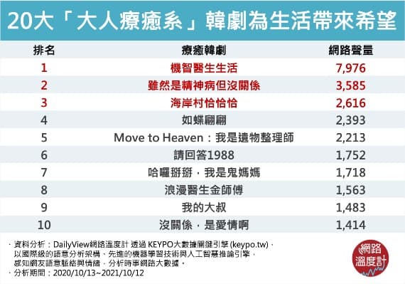 今天就讓《DailyView網路溫度計》用《KEYPO大數據關鍵引擎》調查,歷年來受到網友推薦的療癒系韓劇,歡迎大家把清單收藏起來~
