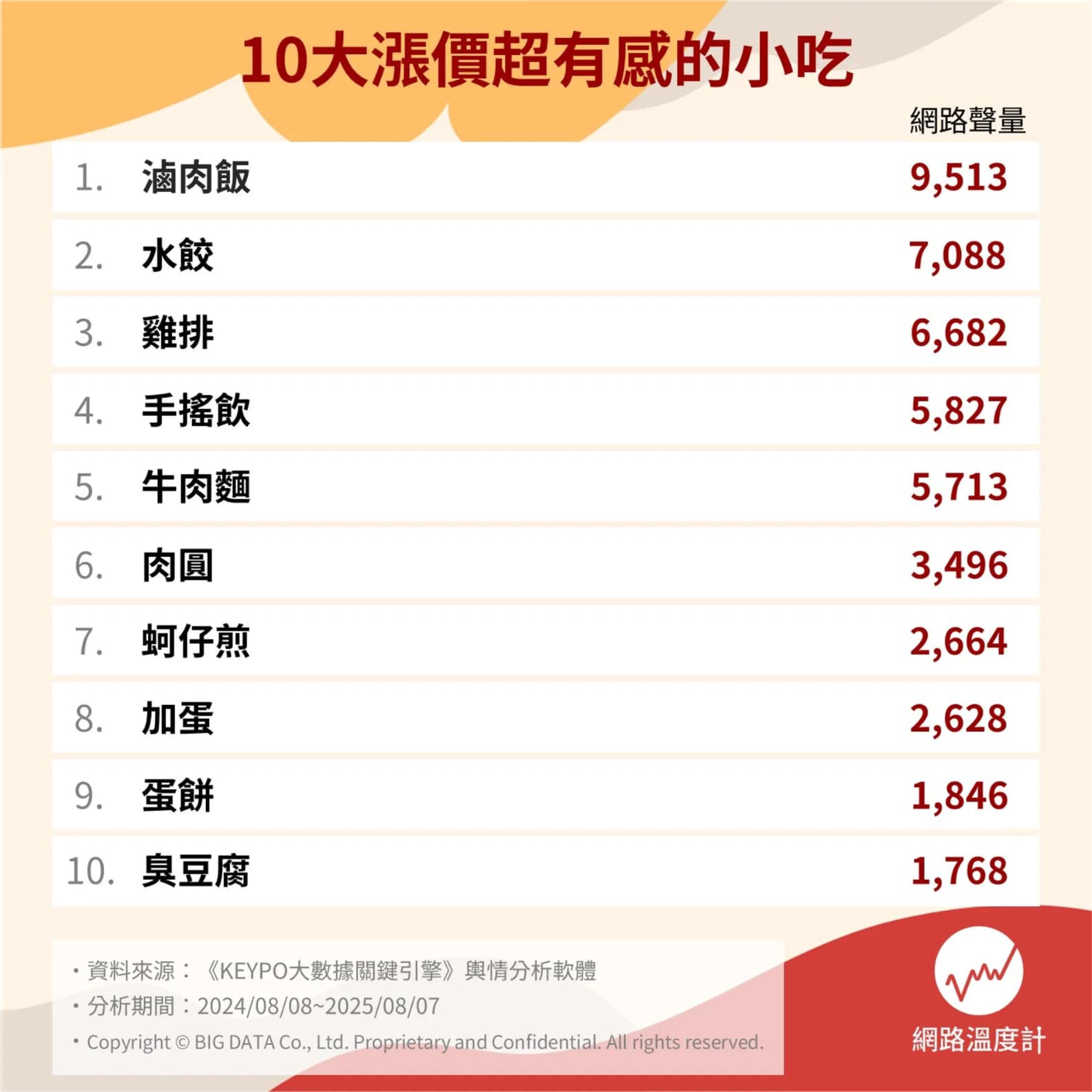 時常在外用餐的你,是否也覺得錢包越來越扁了呢?近日受颱風豪雨影響,多處農田嚴重受損,導致全台蔬菜水果價格飆升,不少品項甚至衝破天價,讓人直呼吃不消。然而,除了近期菜價大幅上漲之外,這幾年的銅板小吃其實也早已悄悄調漲。從早餐店的蛋餅、宵夜必吃的雞排,到台灣人最愛的手搖飲,這些曾經價格親民的庶民美食,如今也讓人在掏錢前多了幾分猶豫。《網路溫度計DailyView》透過輿情分析軟體《KEYPO大數據關鍵引擎》,調查出全台十大漲價最有感的小吃,像是夜市經典的蚵仔煎、台味十足的牛肉麵,以及外酥內嫩的臭豆腐全都榜上有名,你心中漲幅最驚人的小吃又是哪一樣呢?快一起來揭曉榜單吧!