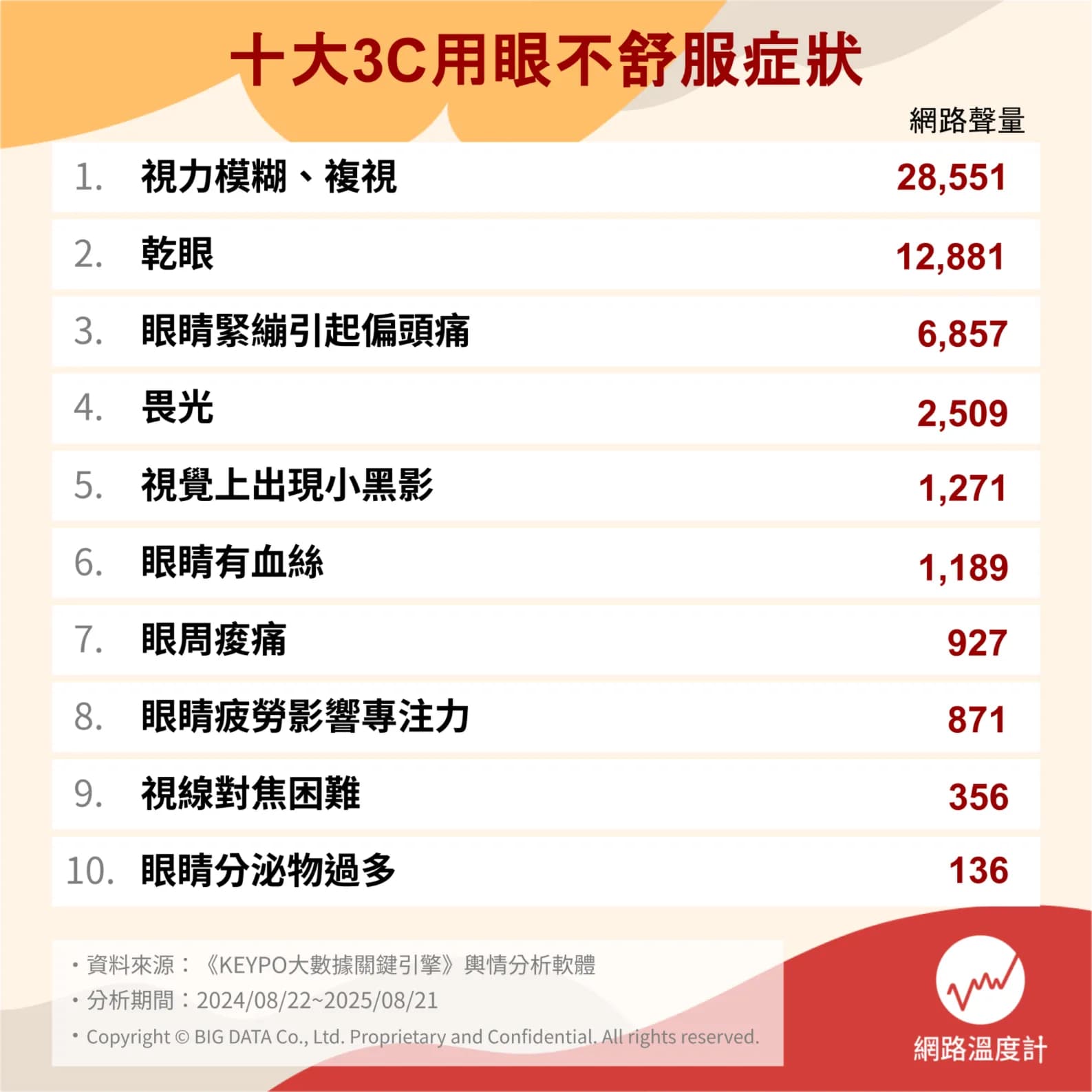究竟有哪些症狀是3C族、低頭族最常見、卻又最容易忽視的呢?《網路溫度計DailyView》透過輿情分析軟體《KEYPO大數據關鍵引擎》,盤點十大3C用眼不舒服症狀,不只有網友的經驗分享,還有不藏私告訴你的預防小撇步。快把這篇文章轉給身邊那個滑手機滑到停不下來的朋友,一起守護彼此健康吧!