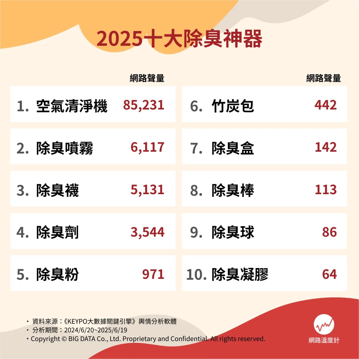 鞋櫃、冰箱、浴室或車內等容易積聚氣味的地方,該怎麼辦?這時除臭產品就派上用場了!臭味通常來自細菌分解產生的揮發性物質,不僅讓人心情不佳,長時間還可能影響健康。適當使用除臭產品,可以抑制細菌滋生、分解異味分子,維持空氣清新。更重要的是,它能提升生活舒適度與社交自信,不必擔心因體味或環境異味而產生尷尬。除臭產品看似小物,卻是維持居家、辦公甚至外出環境清爽的重要幫手。使用除臭產品的好處不僅在於消除惱人的異味,還能有效改善生活環境品質。《網路溫度計DailyView》透過輿情分析軟體《KEYPO大數據關鍵引擎》,統計整理近一年來的十大常見除臭產品,快來看哪個最適合你!