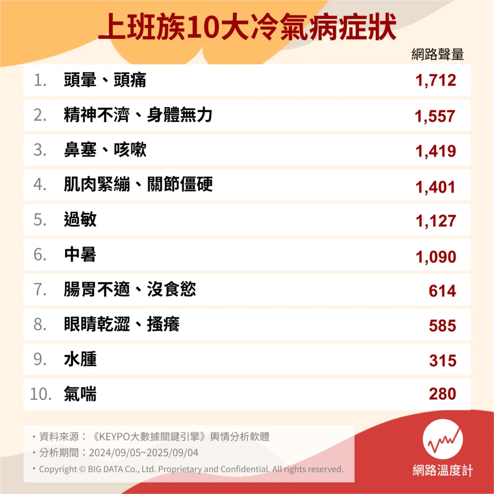 更糟的是,看似無害的冷氣房,卻暗暗埋著健康隱憂。過敏、氣喘容易復發,一個噴嚏接著一個停不下來。尤其9、10月連假多,許多人假期前熬夜趕進度,假期一結束又立刻回到崗位,疲憊與不適更容易被「冷氣病」放大。這些看似小小的不舒服,其實正悄悄侵蝕著上班族的日常與健康。《網路溫度計DailyView》透過輿情分析軟體《KEYPO大數據關鍵引擎》,盤點上班族最常遇到的十大冷氣病症狀,快來看看你中了幾項!
