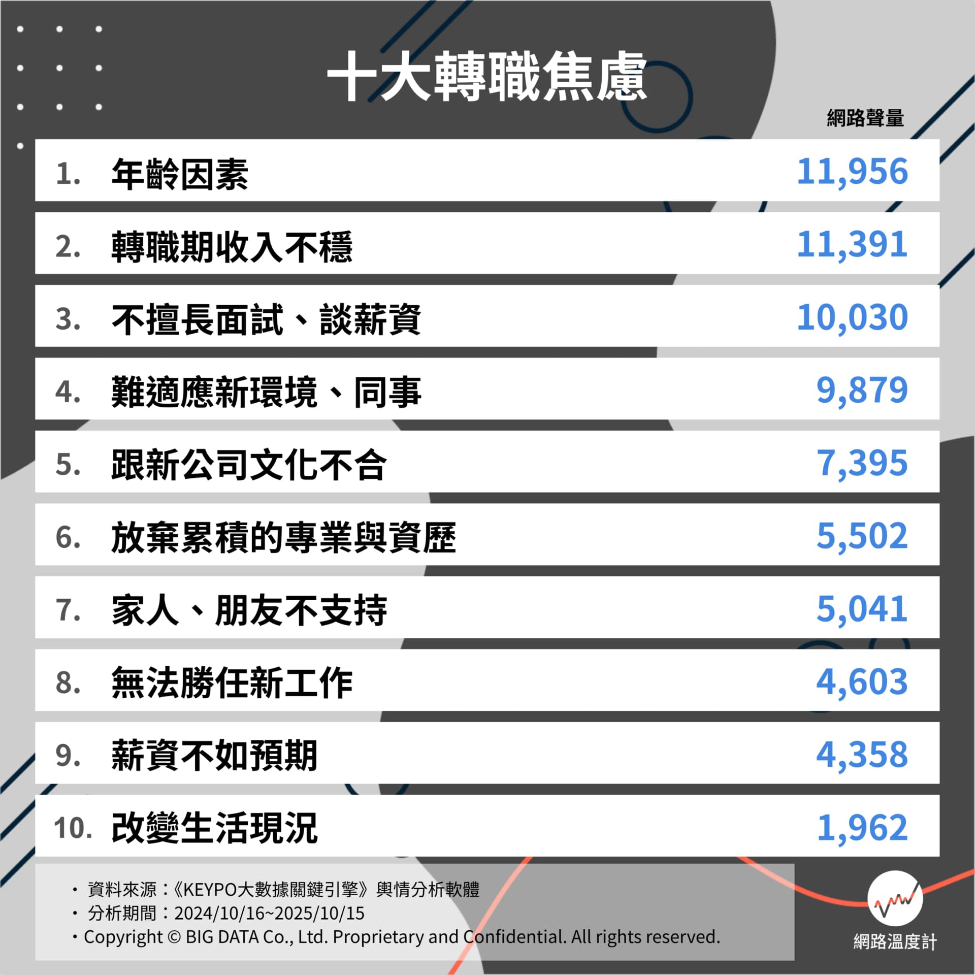 但想轉職,說得容易、做起來卻五味雜陳。新的挑戰、未知的風險,加上心理壓力,總讓人猶豫不決。《網路溫度計DailyView》透過輿情分析軟體《KEYPO大數據關鍵引擎》盤點十大轉職焦慮,帶你一探多數人卡在「想走不敢走」的真實原因。
