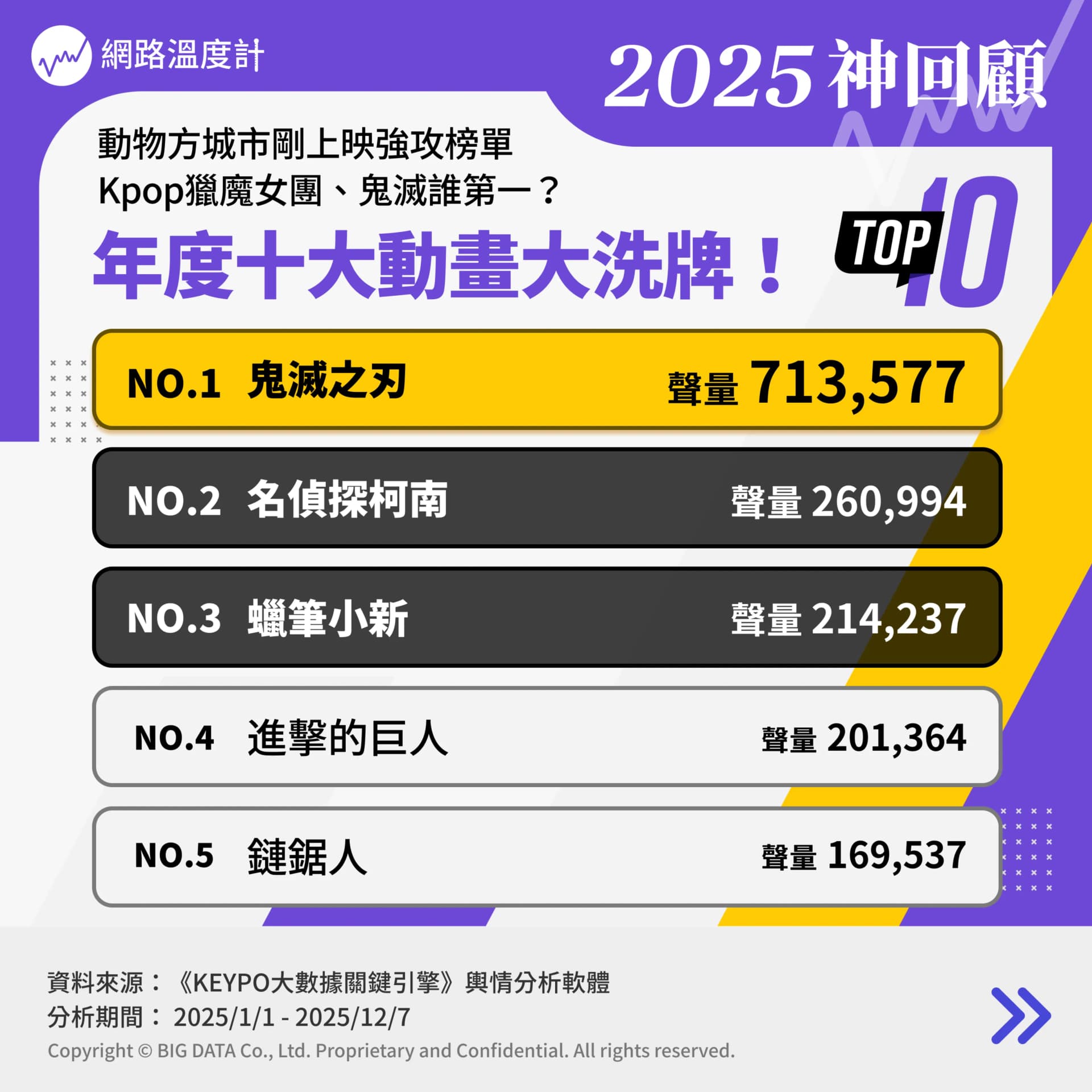《網路溫度計DailyView》透過輿情分析軟體《KEYPO大數據關鍵引擎》,鎖定2025年1月1日至12月7日期間,以「2025年上映的動畫電影」的網路討論熱度作為觀察切點,分析各大動畫IP在社群平台上的整體聲量表現,並據此整理出2025年度最受關注的十大動畫IP。究竟是哪個動畫IP成功殺破重圍,成為討論焦點?完整榜單一次看。