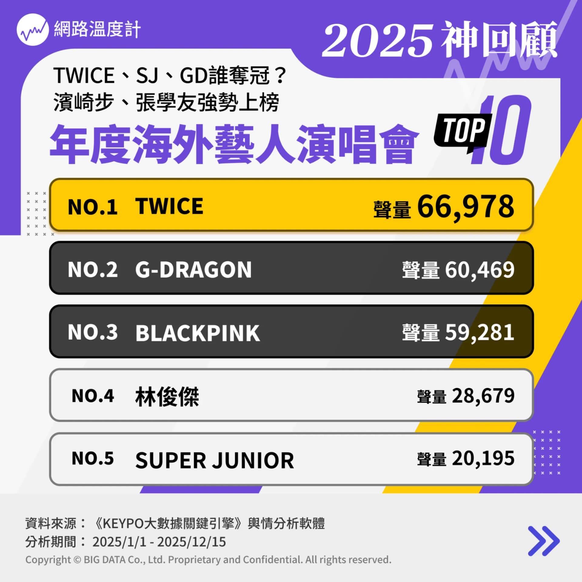 在這眾星雲集的一年,究竟哪一場演出最令網友難忘?誰又霸佔了全年的話題版面?《網路溫度計DailyView》透過輿情分析軟體《KEYPO大數據關鍵引擎》,調查2025年1月1日至12月15日期間海外藝人在台演唱會的網路聲量,帶您一揭「年度海外藝人演唱會TOP 10」排行榜!