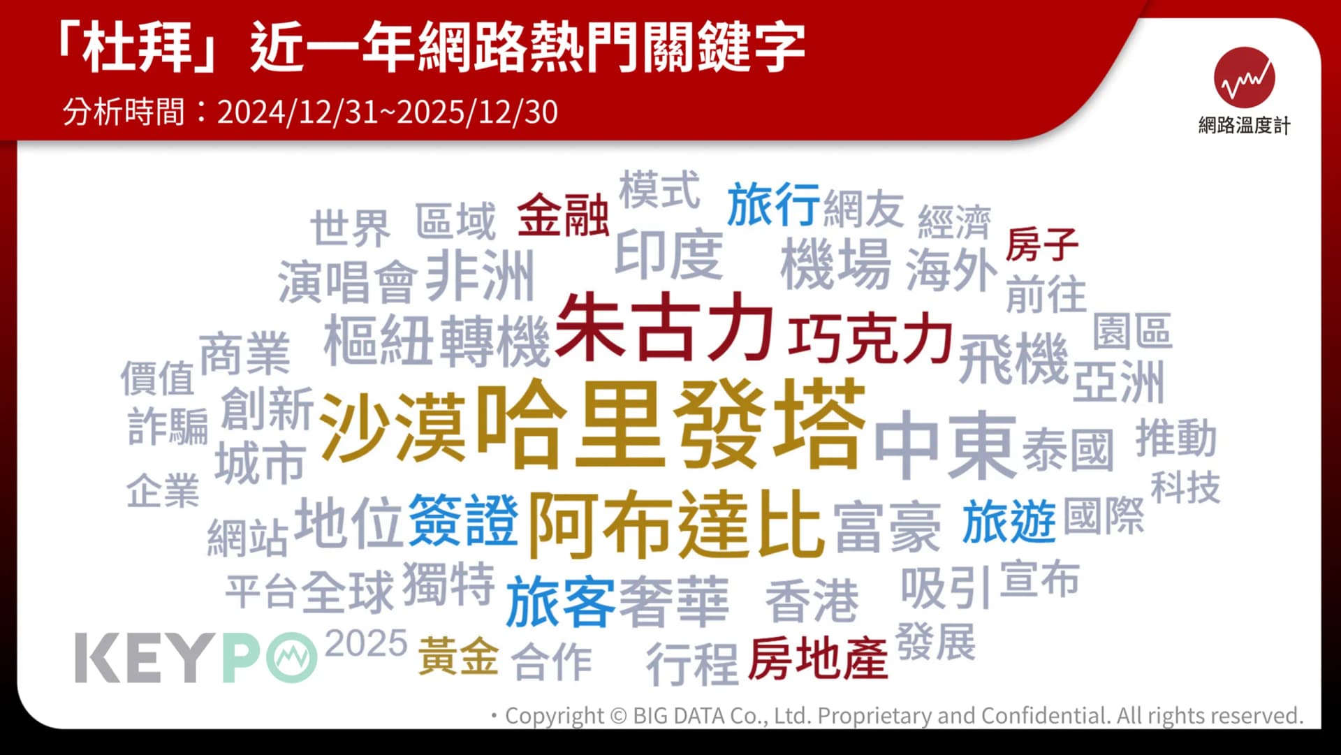 不過,撇開甜蜜的巧克力與熱絡的房市,杜拜究竟還有那些吸引力呢?《網路溫度計DailyView》透過輿情分析軟體《KEYPO大數據關鍵引擎》,調查近一年(2024/12/31~2025/12/30)的網路熱門關鍵字,發現除了美食與投資,「哈里發塔、沙漠、旅遊」等字眼聲量始終居高不下。因此,本文特別整理出網友討論度最高的「十大杜拜熱門景點」;從沙漠中的冰雪世界到直衝雲霄的摩天高樓,不管你是想體驗遍地黃金的震撼,還是追隨名人腳步拍出時尚大片,這份榜單絕對是你2026年規劃杜拜旅遊的最佳指南!