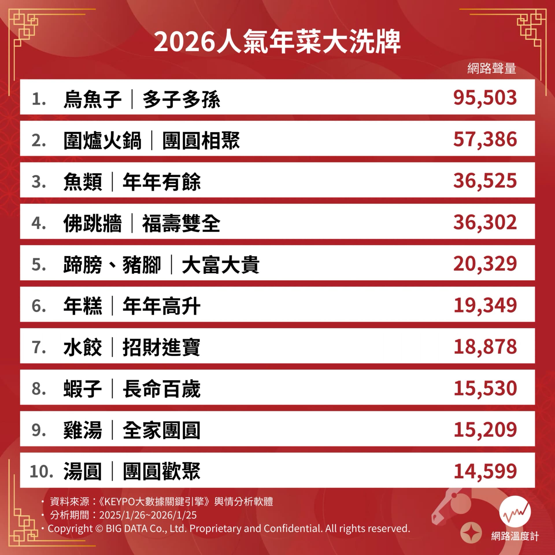 隨著農曆新年腳步逐漸逼近,家家戶戶開始在廚房與市場間張羅,只為端出一桌豐盛的圍爐盛宴。從年節餐桌上不可或缺的經典蘿蔔糕、皮Q肉彈的油亮蹄膀,到將海味珍饈濃縮入甕的佛跳牆,以及暖胃又暖心的濃郁雞湯等,各式年菜輪番上桌,光是視覺便足以令人垂涎三尺。而這整桌的年菜不單是味蕾的饗宴,更是將一整年的吉祥寓意與團圓祈願,通通化作入口的福氣。《網路溫度計DailyView》透過輿情分析軟體《KEYPO大數據關鍵引擎》,去年曾盤點「十大人氣年菜」,當時由聲量逼近七萬的圍爐火鍋勇奪人氣冠軍,佛跳牆與烏魚子則緊追在後,時隔一年再度啟動調查,這次榜單竟迎來意想不到的大洗牌!究竟今年的年菜人氣王換誰當?去年落榜的菜色是否有望成黑馬?最新年菜聲量戰況馬上揭曉!