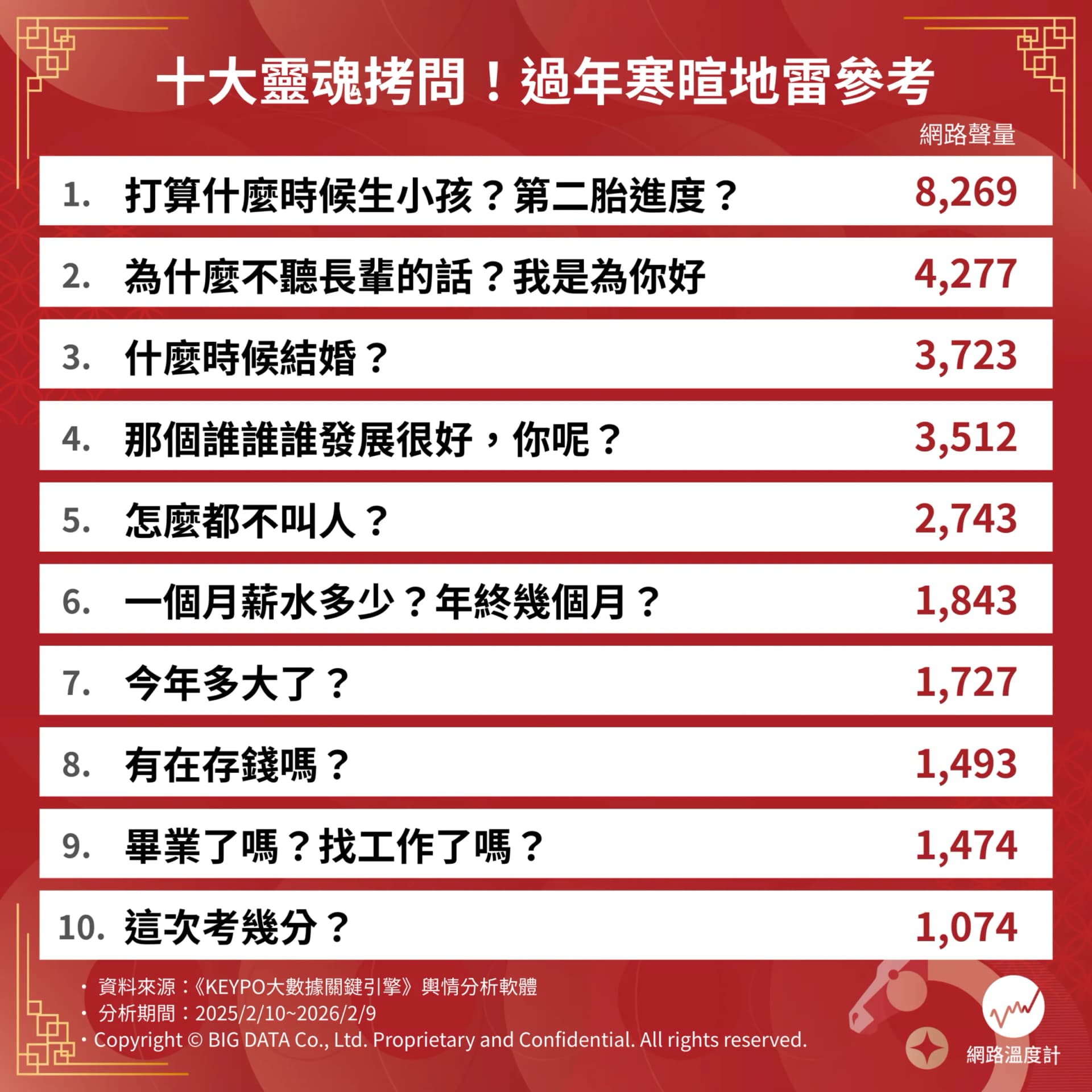 這些問題看似日常寒暄,卻在社群平台累積大量討論與共鳴。《網路溫度計DailyView》蒐集過年期間常見的親戚長輩問句,透過輿情分析軟體《KEYPO大數據關鍵引擎》調查近一年(2025/2/10~2026/2/9)的網路討論聲量。從聲量分布可以發現,長輩、親戚的提問,多半圍繞結婚、生育與收入等「人生進度」議題,也因此更容易讓對話從閒聊變成壓力。究竟哪一句拿下聲量冠軍?接下來揭曉十大靈魂拷問,會讓人覺得超煩、很躁,這些地雷真的看過,就別再問!