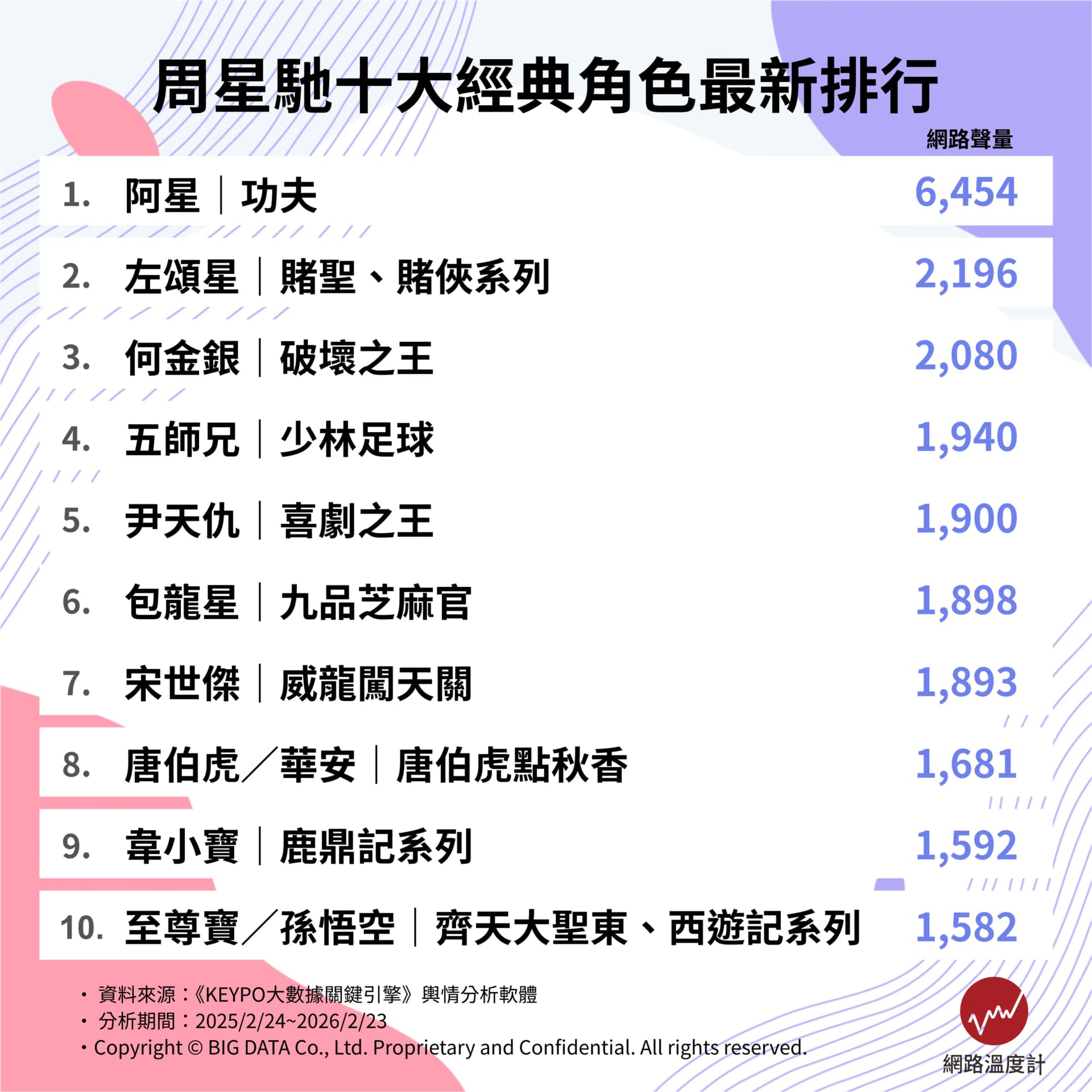 對不少人來說,星爺根本是華語電影的名梗製造機,《網路溫度計DailyView》早在2014年盤點過一次周星馳十大經典角色排行,史蒂芬周《食神》勇奪冠軍!但觀眾世代更替,社群平台改變,引用方式也不同;時隔12年,透過輿情分析軟體《KEYPO大數據關鍵引擎》觀察近一年(2025/2/24~2026/2/23)網路討論聲量,再次整理出星爺從影以來逾四十部的作品中,討論度最高的十大經典電影角色,也陪大家重新回味周星馳獨特的幽默與角色魅力。