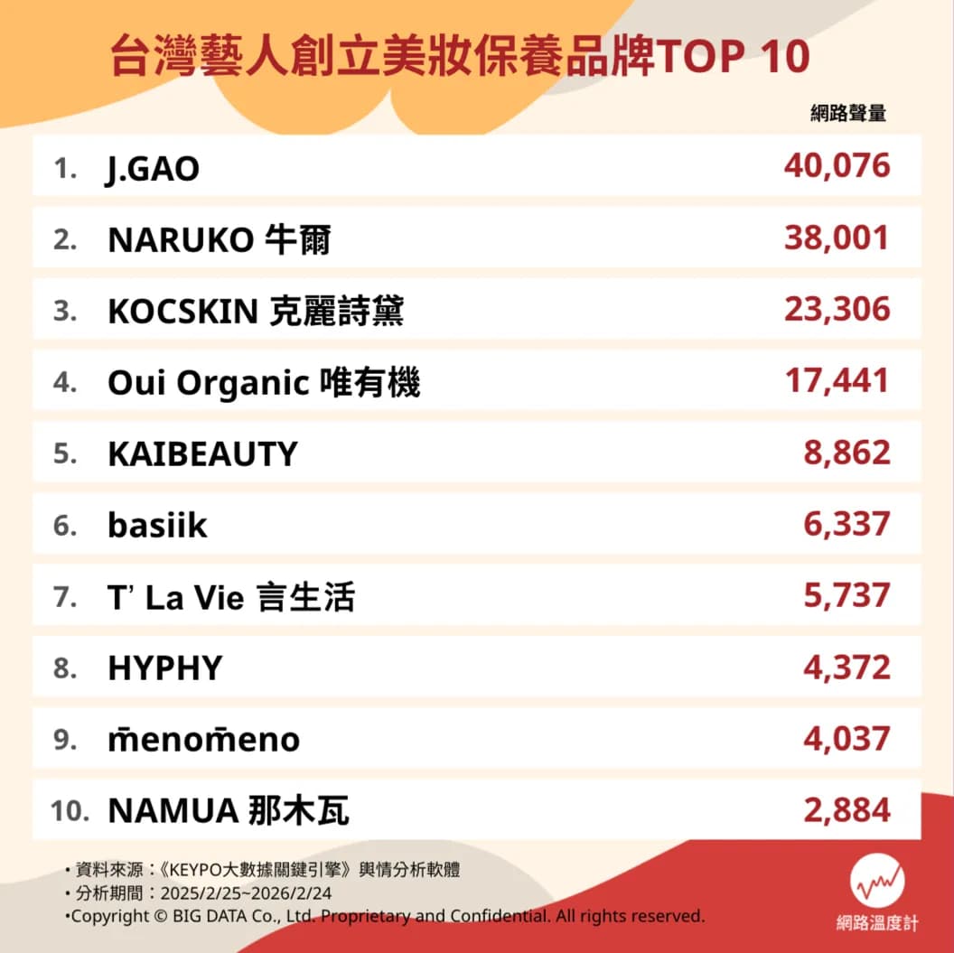 究竟哪幾位藝人成功用明星光環與產品實力擄獲粉絲與消費者的心?《網路溫度計DailyView》透過輿情分析軟體《KEYPO大數據關鍵引擎》,盤點台灣藝人(包含通告藝人)創立的美妝保養品牌TOP 10。白色情人節將至,如果還在煩惱送什麼才能兼具心意與質感,不妨從這些美妝保養品牌下手,不論是送另一半、曖昧對象,還是犒賞自己,都能送到心坎裡,未來《網路溫度計DailyView》也將依不同時節與送禮需求,持續推出不同主題的《送禮溫度計》,協助讀者在各種送禮場合中,輕鬆挑到合適、不踩雷的送禮選擇。今年就用明星同款的美麗秘密,替感情加溫吧!