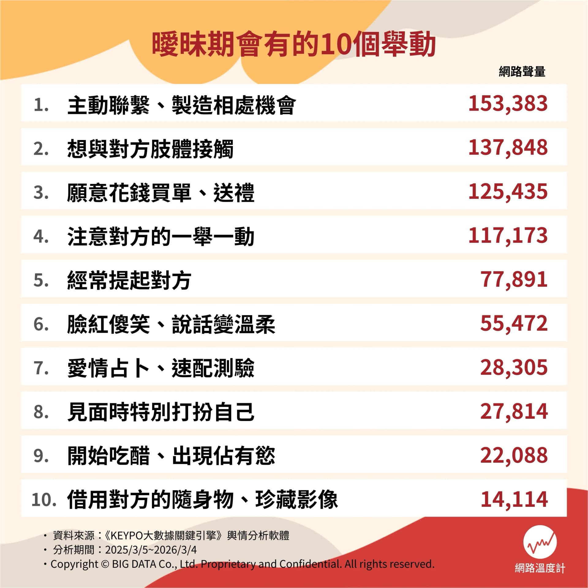 當感情在心裡慢慢發芽,暗戀的情緒也會一點一滴累積。很多時候,一些不經意的小舉動就藏著真實心意,會忍不住想多和對方聊幾句、找機會見面,也會在不知不覺中記住對方的喜好與生活中的點滴。《網路溫度計DailyView》透過輿情分析軟體《KEYPO大數據關鍵引擎》,整理出喜歡一個人的10個曖昧舉動,看看這些小訊號,你中了幾個?