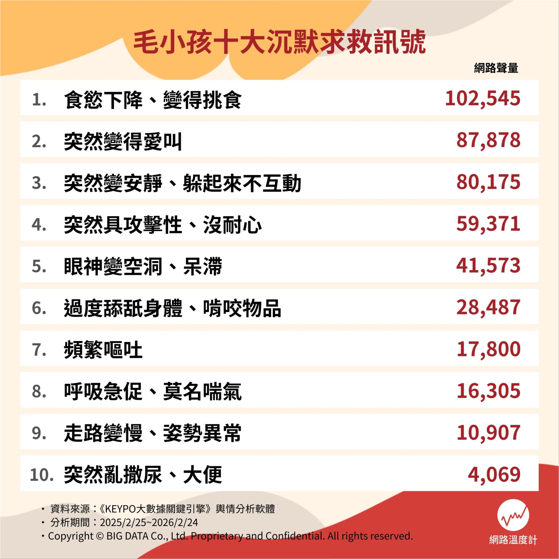 《網路溫度計DailyView》透過輿情分析軟體《KEYPO大數據關鍵引擎》,盤點毛小孩十大沉默求救訊號。在毛孩數量正式超車小孩的時代,會不會挑罐頭已經不夠,真正的關鍵,是能不能第一時間看懂牠沒說出口的那句:「我不舒服。」