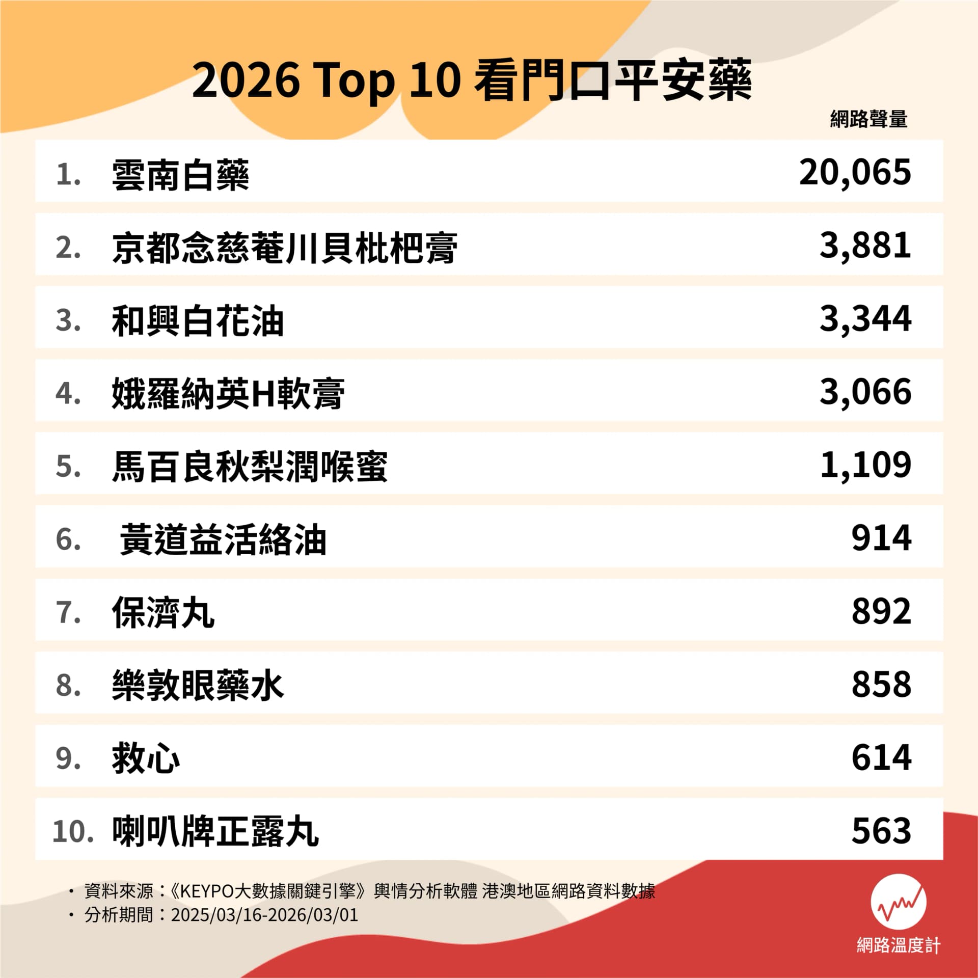 今年個排行榜結果真係勾起大家無限共鳴,有由細用到大嘅萬用神膏,亦有連外國巨星都搶購嘅養聲名物。究竟邊款藥品成為全港最具人氣嘅「平安藥天花板」?《DailyView 網路溫度計》透過《KEYPO 大數據關鍵引擎》,為大家盤點 2026 年全港 Top 10 最具熱度家居看門口藥,即刻 Save 低個名單,今個週末去藥房補倉啦!
