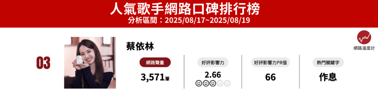 而這段「早睡保養論」立刻在網路掀起熱議!根據《網路溫度計》的「人氣歌手」口碑聲量排行三日榜(2025/8/17~8/19),蔡依林目前暫居第三,「作息、睡覺、規律」等都因這起事件成為討論焦點。