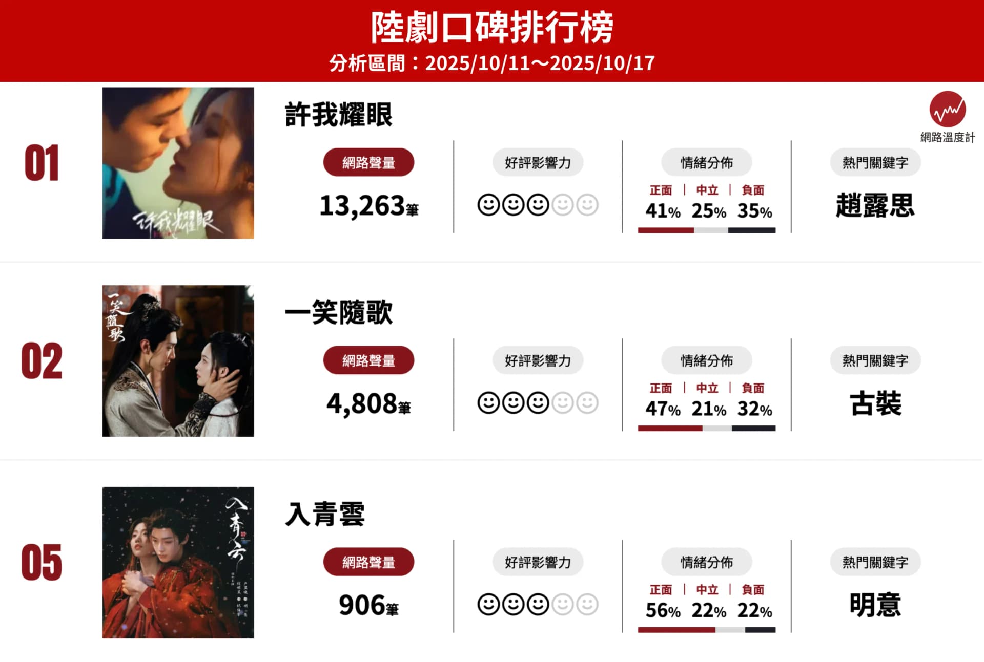 今年下半年,陸劇新作不再只求甜寵或修仙打怪,「真情裂縫、權謀戰場、身份謊言」成為主力題材。《網路溫度計DailyView》根據「陸劇」網路口碑聲量近一週排行榜(2025/10/11~10/17),盤點三部口碑爆紅陸劇,各自從不同角度擊中觀眾痛點:野心女逆襲、亂世將軍戀、身份騙局與真實救贖。接下來,就從人物設定、劇情亮點、幕後與網友反應,帶你一次看懂這三部劇,哪部最對你的味?