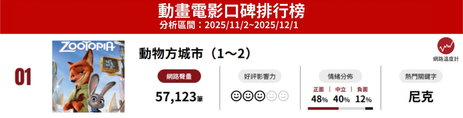 《動物方城市2》你看了嗎?這部久違的續作一開跑便登上各大熱搜。在《動物方城市2》上映前,《網路溫度計DailyView》已於11月10日報導〈電影特典、威秀獨家周邊、預售時程全攻略〉,根據當時的口碑分析,《動物方城市2》已強勢攻佔「動畫電影」口碑聲量的三日榜、週榜與月榜前五名。如今該片於11月26日正式上榜後,更在短短不到一週內迅速竄升至第一名,一舉擊敗長期霸榜、掀起全球話題的《Kpop 獵魔女團》,成為近期社群上討論度最高、強勢洗版的動畫電影。