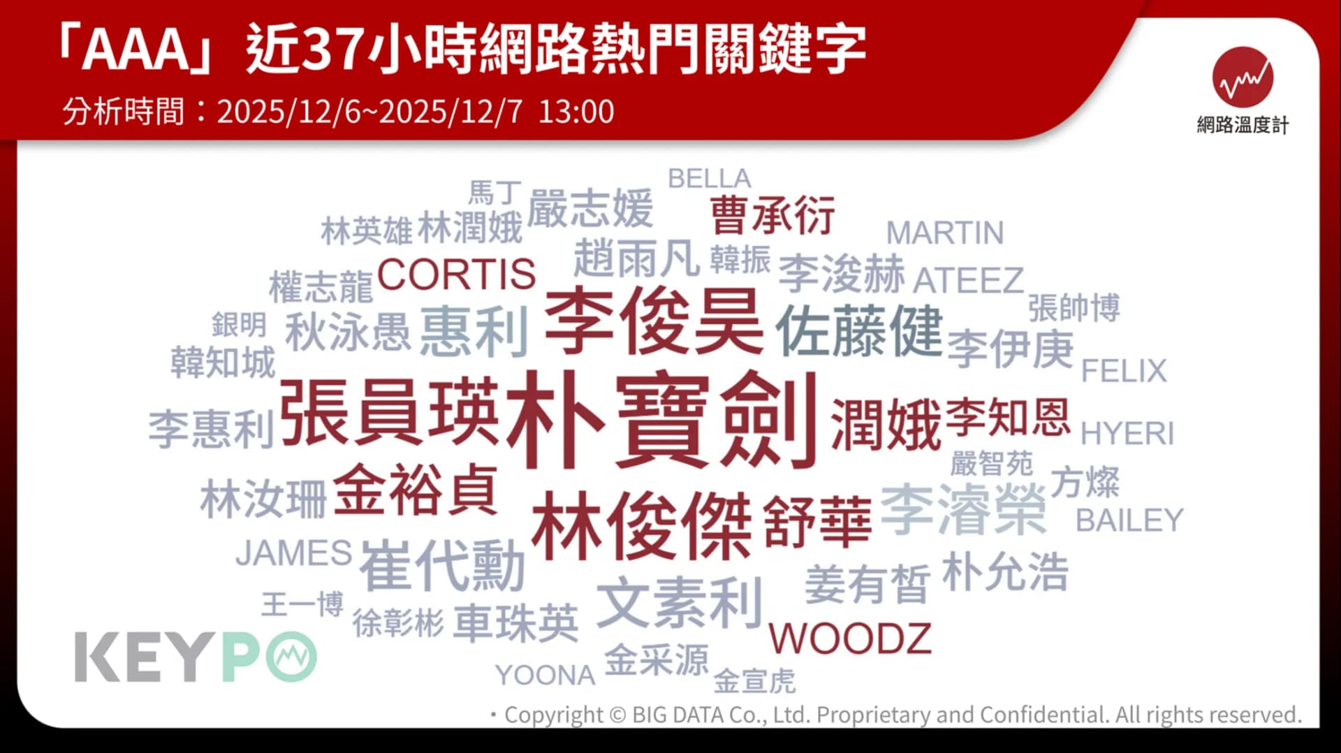 透過《KEYPO大數據關鍵引擎》輿情分析軟體調查,「AAA」相關話題自12月6日至7日下午1點,討論聲量已突破2萬筆,「朴寶劍、李俊昊、張員瑛、林俊傑、舒華」等關鍵字也迅速成為社群熱議焦點。馬上跟著《網路溫度計DailyView》一起來重溫AAA精彩瞬間吧!