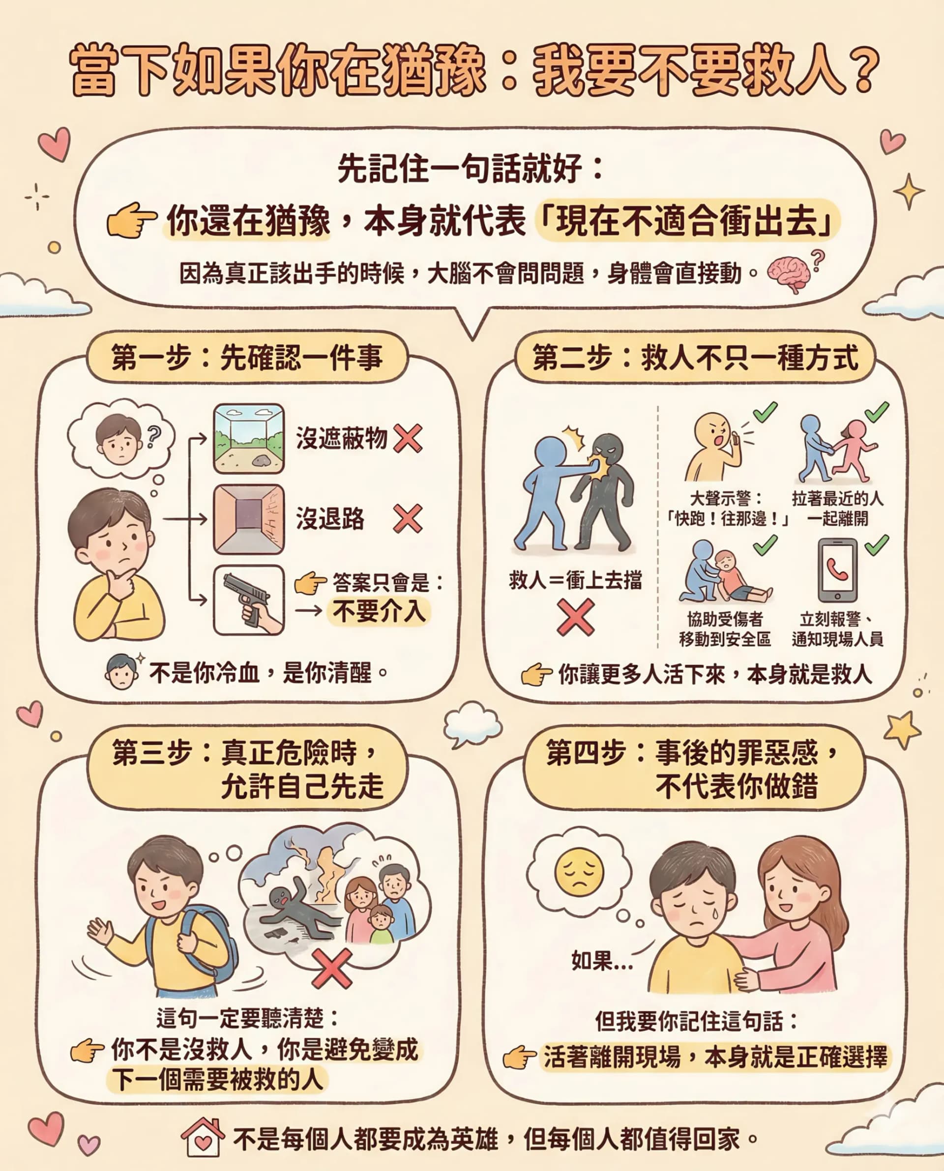 此外,針對孩童在公共場所可能面臨的安全風險,全職媽媽兼自媒體經營者陳誼也在Threads分享「孩童自救」、「要不要救人」圖卡,整理5招自保口訣,強調教會孩子在緊急情況下保護自己同樣重要。她表示,「對媽媽來說,保護孩子不只是在身邊的那一刻,而是讓孩子在不在視線內時,也知道怎麼安全回家。」