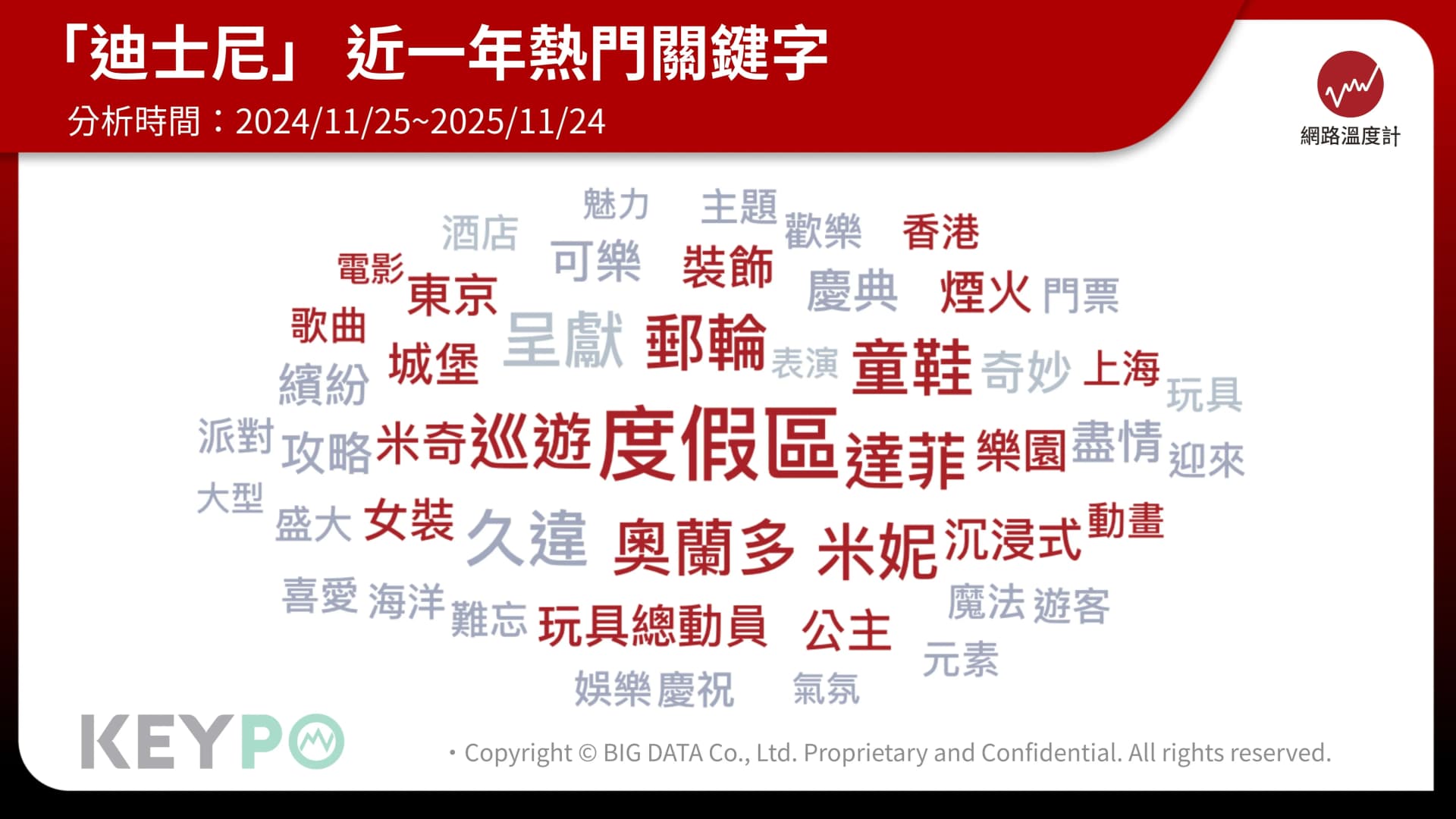 另外從《KEYPO大數據關鍵引擎》輿情分析軟體來看「迪士尼」近一年熱門關鍵字,可以看到樂園、度假區、香港、上海、東京、奧蘭多、巡遊、煙火、郵輪、女裝、裝飾、童鞋、城堡、公主、米奇、米妮、達菲、玩具總動員、電影、動畫、歌曲、沉浸式等字詞。