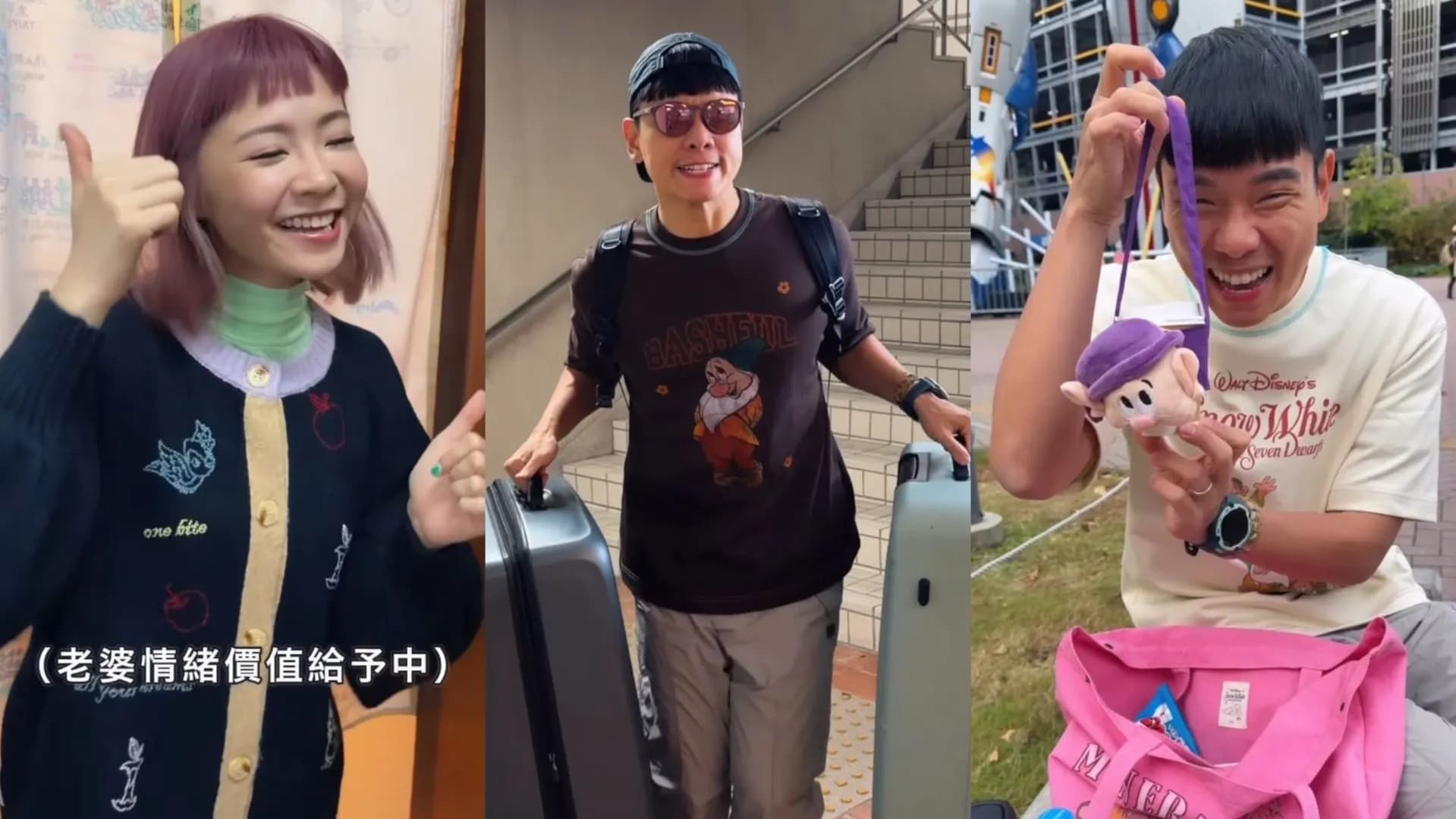 八弟最後更不忘展現「出門在外什麼都要準備好」的貼心,包包裡滿滿都是迪士尼系列配件,像是just one bite寬條紋跳色圍巾、糊塗蛋立體娃娃吊飾飲料提袋,實用之餘也能替整體造型加分。