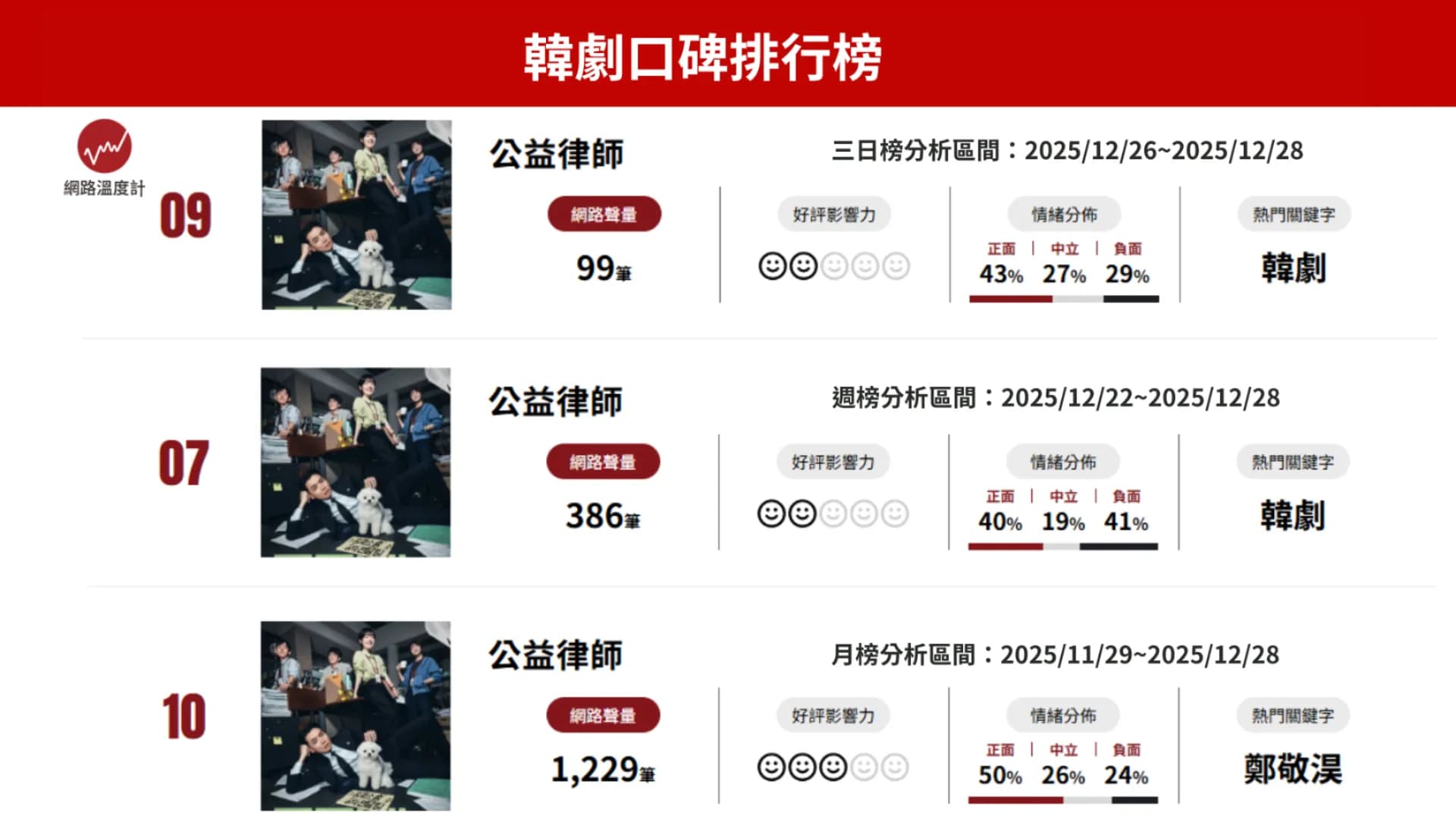 該劇在韓國收視表現亮眼,從首播的4.5%一路攀升至第8集創下9.1%的自身新高,在Netflix上也攻佔香港、台灣等7個國家與地區的TOP 10榜單。網路討論度同樣火熱,根據《網路溫度計DailyView》的「韓劇」口碑聲量排行榜,《公益律師》在近三日、周榜以及月榜分別拿下第九、第七和第十名。