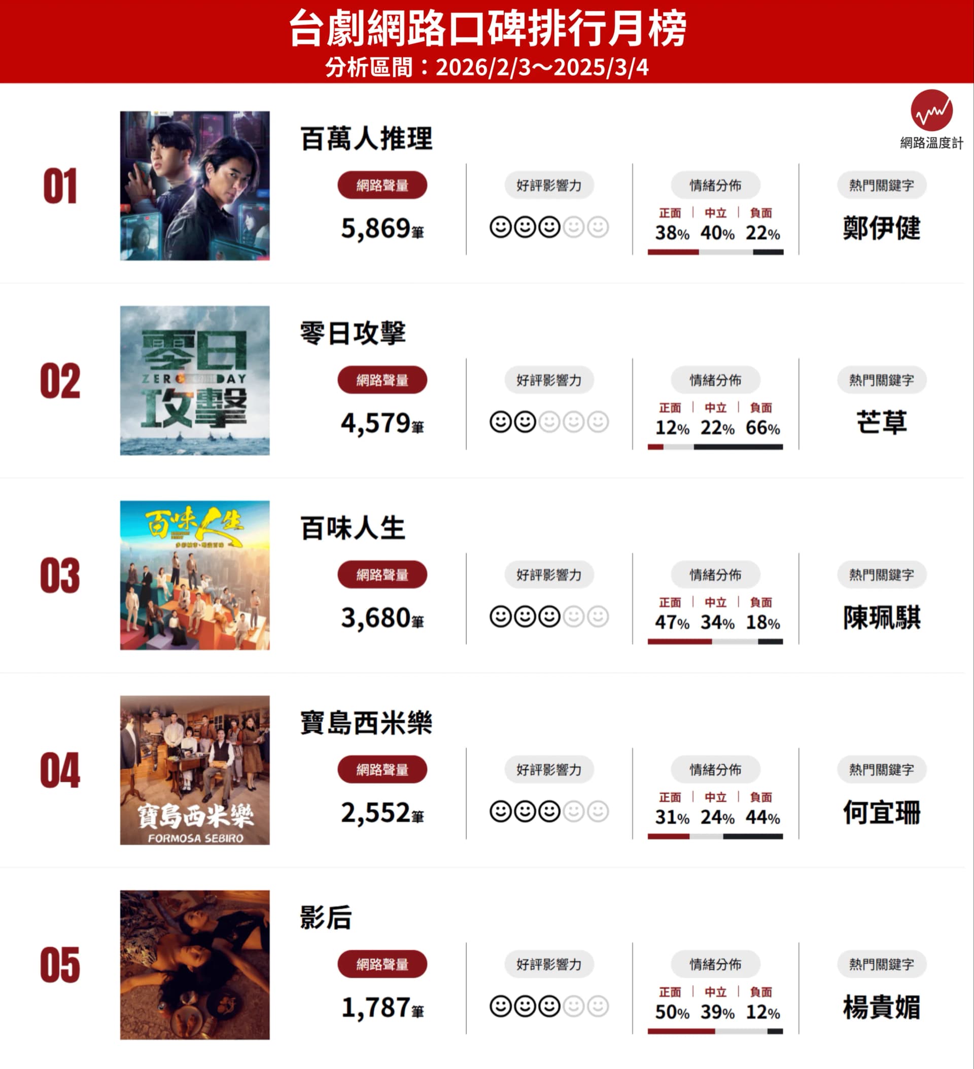 「銅鑼灣只有一個浩南!」提到港片黃金年代,不少人腦海裡第一時間浮現的,往往是鄭伊健的身影,他曾是無數影迷青春記憶的一部分。多年過去,這位港星首度以台劇作品回到觀眾視野。根據《網路溫度計DailyView》網路口碑聲量「台劇」排行月榜(2026/2/3~3/4)統計,冠軍寶座就是由鄭伊健主演的《百萬人推理》,「鄭伊健」也成為最顯目的熱門關鍵字,顯示這位港星的參與,對劇集話題發酵具關鍵推力。