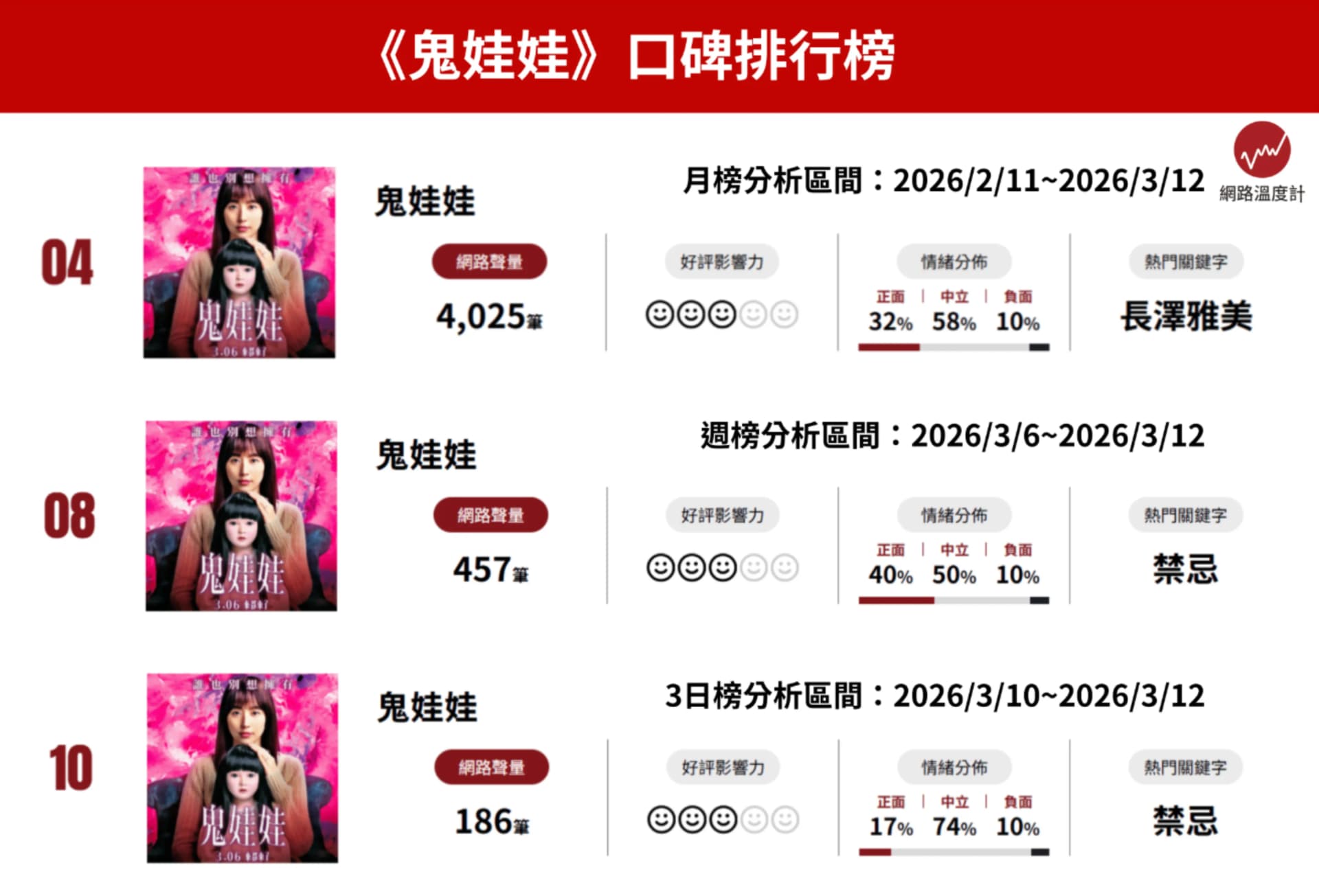 透過《網路溫度計DailyView》「外語片」聲量口碑榜可以發現,《鬼娃娃》的口碑聲量在月榜排行中,還能擠進前五名,但上映之後聲量不如預期,排行不斷下滑,近3日已下滑至第10名。而《咒死你》目前的聲量仍不足,並未入榜,仍待上映後觀察觀眾反應。