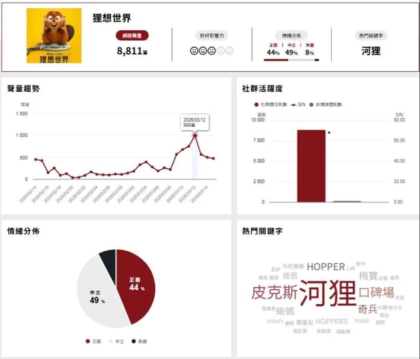 雖然《狸想世界》台灣要到3月18日才正式上映,但目前已在影迷與社群平台掀起一波討論潮,更在《網路溫度計DailyView》動畫電影口碑排行月榜中,一舉竄升第一名,觀察聲量高點,3月12日舉辦搶先口碑場期間,在社群立刻引爆討論潮,熱門關鍵字則是「河狸」。不少還沒看過電影的網友開始好奇:這部動畫到底在演什麼?為什麼評價這麼高?皮克斯將河狸設定為主角的原因?